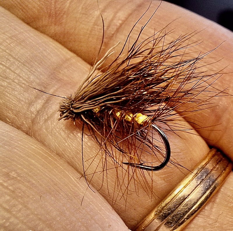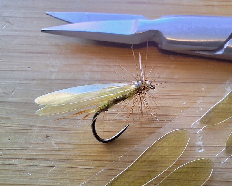 I’ve been intrigued by high numbers of stoneflies on Exmoor for several seasons, but if I’m honest, I’ve never really gone to town with a specific pattern to copy the “Yellow Sally”. If ever a fly pattern called for a specific outline and ingredients, this is it! They are not overly huge insects, hence I trimmed down the size M artificial wings. Nor do the wings splay out on the real insect, but sit on the back most of the time. This looks so much more the part than flies such as the Wickhams Fancy and others I usually improvise with. I can’t wait to try it out this season!